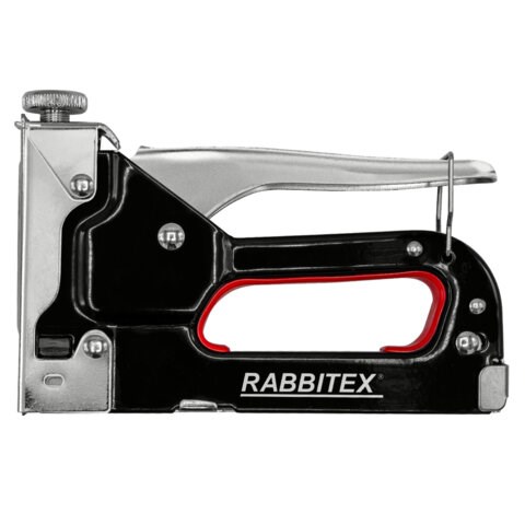 Степлер мебельный RABBITEX изготовлен из закаленной углеродистой стали. Оснащен мощным бойком с регулировкой силы удара, эргономичной рукояткой с надежным хватом, а также скобой-фиксатором для предотвращения самопроизвольного срабатывания степлера. Используется со скобами 53 типа длиной 4 / 6 / 8 / 10 / 12 / 14 мм.