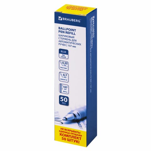Стержень шариковый BRAUBERG 107 мм, с ушками, КОМПЛЕКТ 50 штук, СИНИЙ, пишущий узел 0,7 мм, линия письма 0,35 мм, 170400