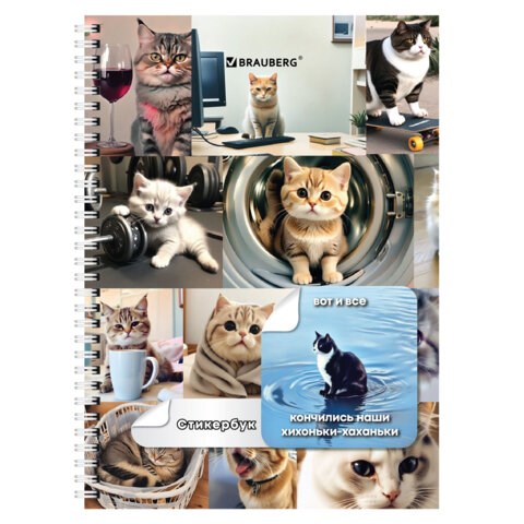 Стикербук ПРОСТО НАКЛЕЙ А6 16 листов 96 цветных стикеров, на гребне, BRAUBERG, Коты мемы, 666050
