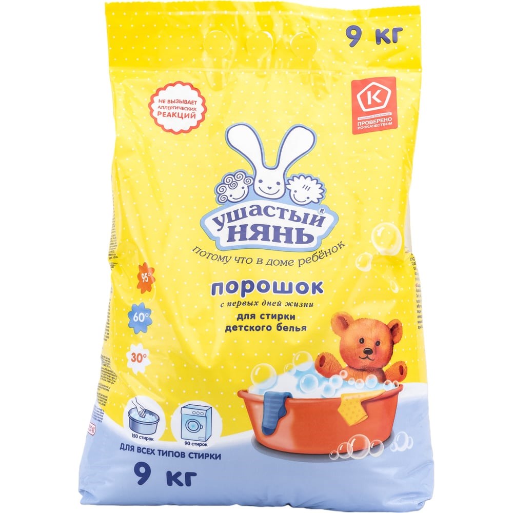Стиральный порошок для всех типов стирки УШАСТЫЙ НЯНЬ 9 кг 01016 600901 разработан для бережного ухода за вещами ребенка. Не содержит мыла, поэтому легко выполаскивается из ткани. Безопасность порошка подтверждена "РНИИТО им. Р.Р. Вредена Росмедтехнологий".