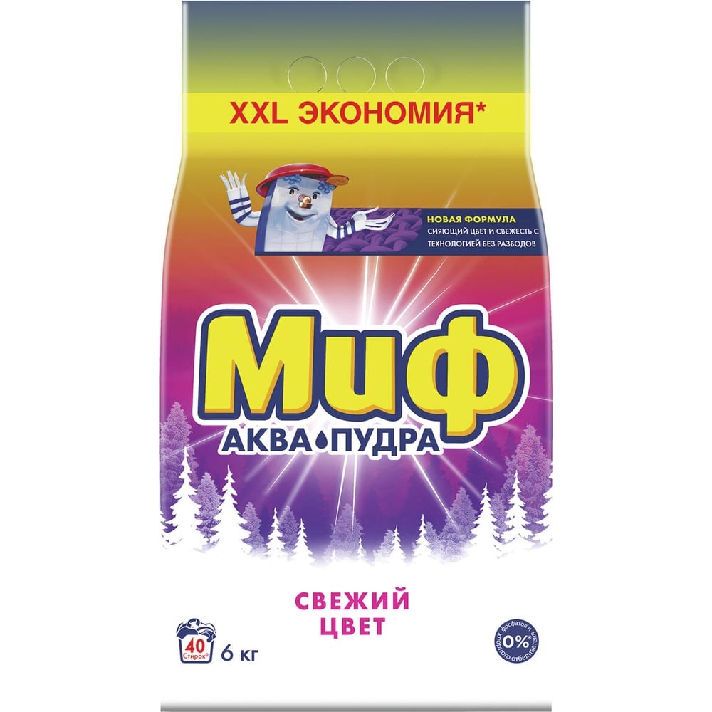 Стиральный порошок автомат Миф Свежий цвет (для стиральных машин) предназначен для стирки цветного и белого белья. Порошок для стирки Миф Свежий цвет отлично очищает и удаляет пятна, сохраняет яркие цвета и придает вещам приятный свежий аромат. Благодаря технологии Аквапудра, Миф Свежий цвет мгновенно растворяется при контакте с водой и хорошо выполаскивается. Преимущества порошка Миф Свежий цвет: Удаляет пятна; Придает аромат свежести и чистоты; Сохраняет яркость цвета; С технологией против разводов; Не содержит фосфаты и хлорный отбеливатель; Все активные компоненты полностью биоразлагаемы. *Выгодный объем упаковки 6 кг позволяет сэкономить на каждой стирке по сравнению с маленькой упаковкой.