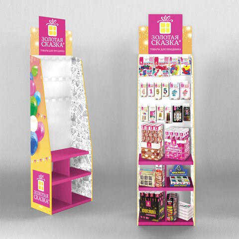 Выполнена из нескольких слоев плотного картона. Повышенная прочность позволяет расположить максимальное количество самых популярных товаров ЗОЛОТАЯ СКАЗКА: от свечей для торта до хлопушек.