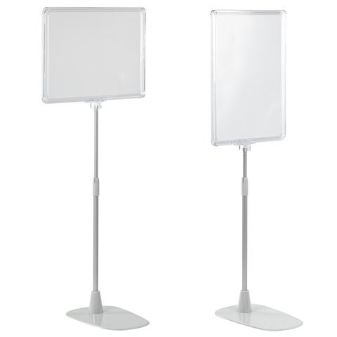 Набор включает в себя пластиковую рамку формата А4 прозрачного цвета, антибликовый карман формата А4, алюминиевую телескопическую трубку с максимальной длиной 550 мм, держатель рамки, пластиковую подставку серого цвета. С помощью данного готового решения можно разместить информацию в различных заведениях: ресторанах, кафе, кондитерских, кофейнях, офисах продаж, магазинах.