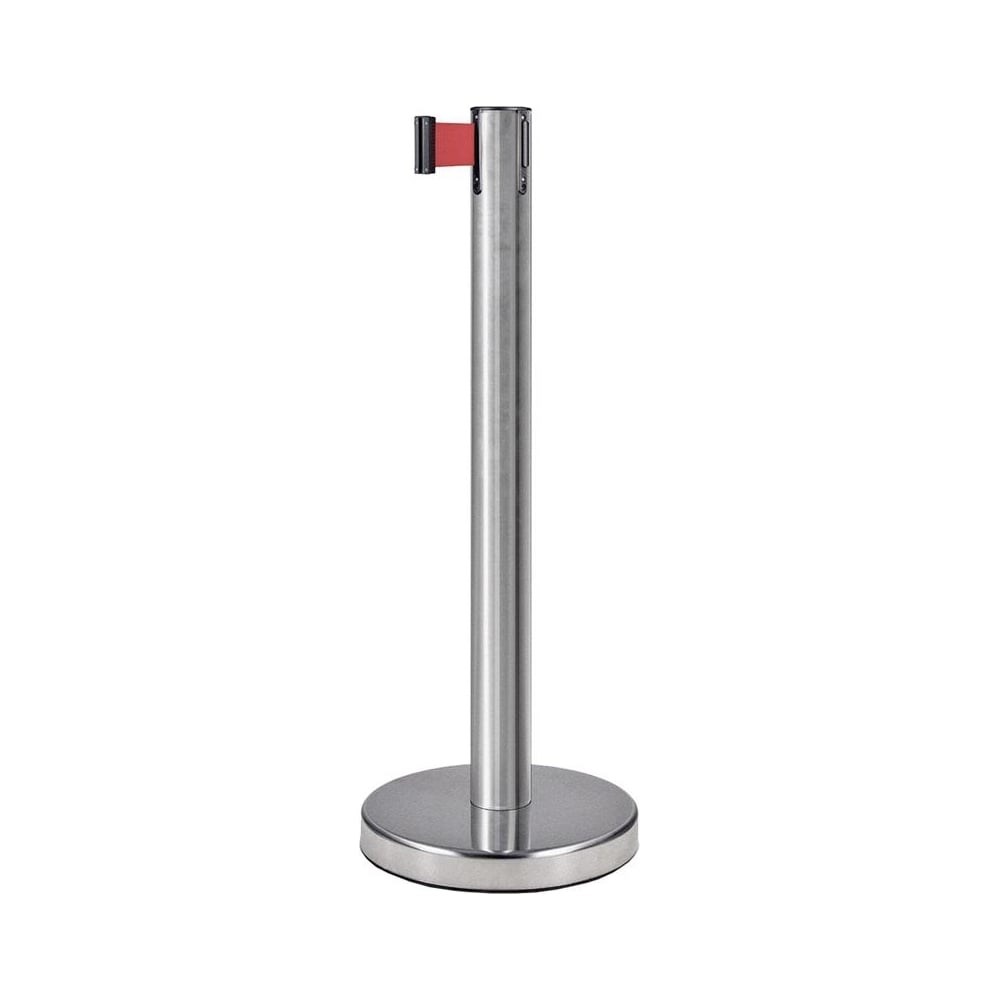 Столбик с вытяжной лентой 5 метров из нержавеющей стали. Состоит из трубы диаметром 76 мм, выполненной из нержавеющей высококачественной полированной стали марки Aisi 304, пластиковой сменной катушки с лентой, дискового основания ограничительного столбика, диаметром 350 мм. Высота стойки 910 мм, диск утяжелитель имеет резиновый кант. Ширина лент 47 мм.