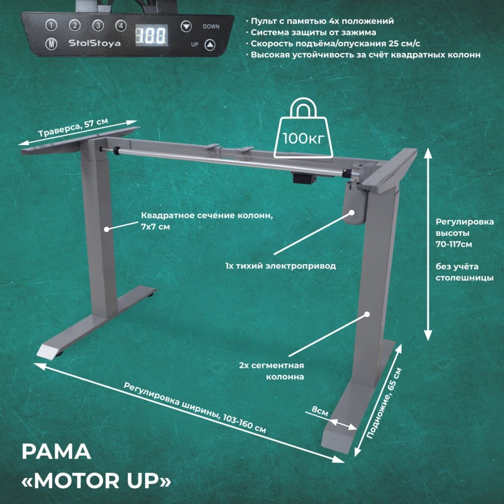 Рама с электроприводом регулировки стола MOTOR UP от компании StolStoya является полным аналогом одной из самой продаваемой рамы в Германии. Особенностью этой модели является направление сегментов колонны вверх, то есть снизу идет более широкая часть и из нее выдвигается более узкая (пирамида). Вторая особенность - квадратное сечение, что увеличивает устойчивость стола для работы стоя в верхнем положенииОсобенности:Устойчивая конструкция.Легкая сборкаРазмер опоры 650 ммРазмер боковой верхней опоры столешницы 570*46 ммРегулируемая ширина от 103 до 160 смРегулировка высоты от 70 до 117 смПодъемный вес - 100 кгПульт управления с возможностью сохранения 4-х положений столешницыЗащита от перегреваФункция изменения параметров движенияЭкран отображающий высоту столешницыЗащита от детей.Цвет: черный, белый, серыйПитание: 120V/230 вольт