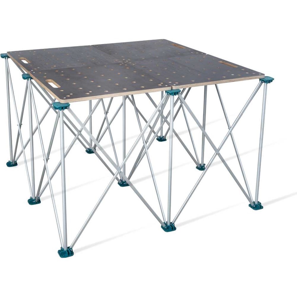 Стол Q4 Ant – это удобная организация рабочего места. Стол Ant используется на строительных объектах и в быту, в гараже и на даче. Может использоваться для выполнения столярных, слесарных, сборочных, раскроечных, малярных, упаковочных и любых других видов работ. Можно использовать как стол - верстак - подмости.Стол имеет комфортную высоту 90см. Состоит из 4-х столешниц и подстолья, состоящего из вертикально расположенных опорных стоек, работающих по принципу телескопа. Стойки стола изготовлены из анодированного алюминиевого профиля. Опоры - из полиамида, самого ударопрочного пластика, стойкого к истиранию и позволяющего выдерживать высокую нагрузку. * Столешница: с перфорацией, изготовлена из влагостойкой ламинированной фанеры 18 мм. Диаметр отверстий в столешнице 22 и 20 мм, которые расположены в шахматном порядке.Особенностью стола Ant является модульность. Конструкция позволяет быстро собирать различные конфигурации повышенной прочности и жёсткости. Одна секция стола 600х600 мм выдерживает равномерно распределенную нагрузку до 300 кг. Рекомендованная нагрузка при конфигурации стола 3х3 - 1200 кг на весь стол.