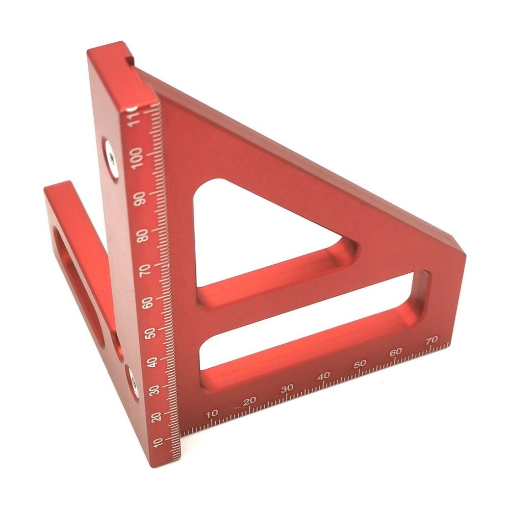 3D столярный разметочный угольник - уникальный плотницкий инструмент, позволяющий значительно сократить время на разметку брусков, ламелей, багета, штапика, досок. Угольник представляет собой прямоугольный трехгранный угол со шкалами по всем направлениям и с возможностью разметки угла 45 градусов. Длина шкал по трем направлениям: 100 мм, 75 мм и 65 мм. Материал угольника - окрашенный алюминий сохраняет в целости как сам угольник, так и размечаемые с его помощью поверхности.