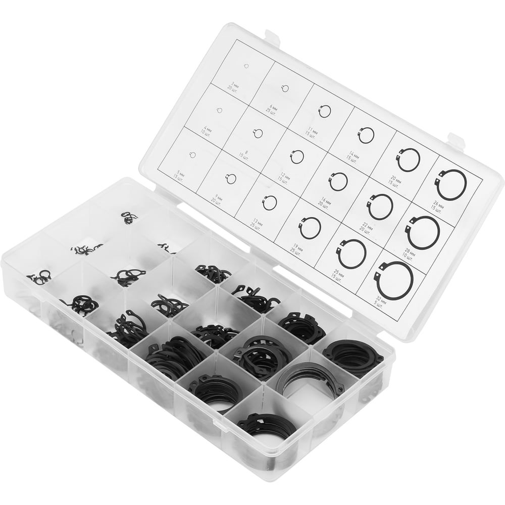 Набор стопорных колец СИБРТЕХ D 3 - 32 мм 300 предметов 47600 имеет в своем комплекте изделия, которые служат для предотвращения смещения деталей относительно друг друга. Стопорные кольца выполнены из прочной стали. Кейс из пластика служит для хранения и компактной транспортировки.