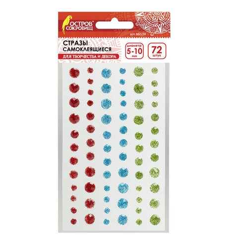 Стразы самоклеящиеся КРУГЛЫЕ, 5-10 мм, 72 штуки, блестящие, на подложке, ОСТРОВ СОКРОВИЩ, 662238