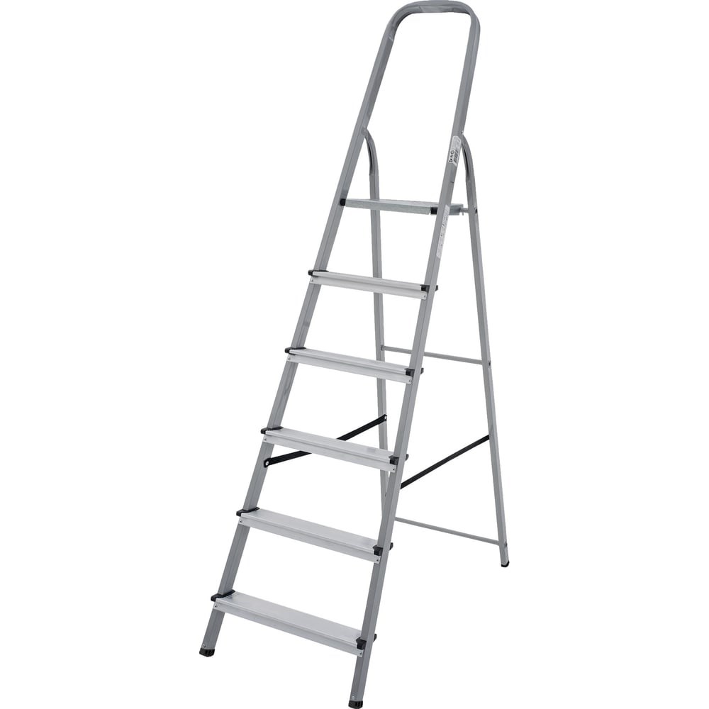 Стремянка Новая Высота сталь/алюминий, 6 ступеней 1130106 идеально подходит для домашних работ. Изготовлена из прочных материалов и имеет надежное соединение ступеней с профилем, что обеспечивает долгий срок службы. Рифленая поверхность ступеней и площадки обеспечивает уверенный подъём и повышенную безопасность. За удобство использования отвечают большая рабочая площадка и широкие ступени.