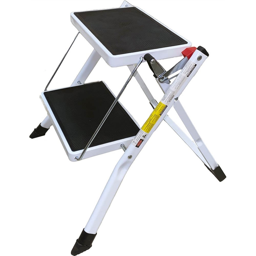 Стремянка используется в быту для выполнения различных работ на небольшой высоте. Широкие ступени с пластиковыми нескользящими ковриками, размером 30х20 см, обеспечивают безопасный подъем/спуск. Для удобства использования предусмотрен механизм раскладывания со специальной клавишей разблокировки.
