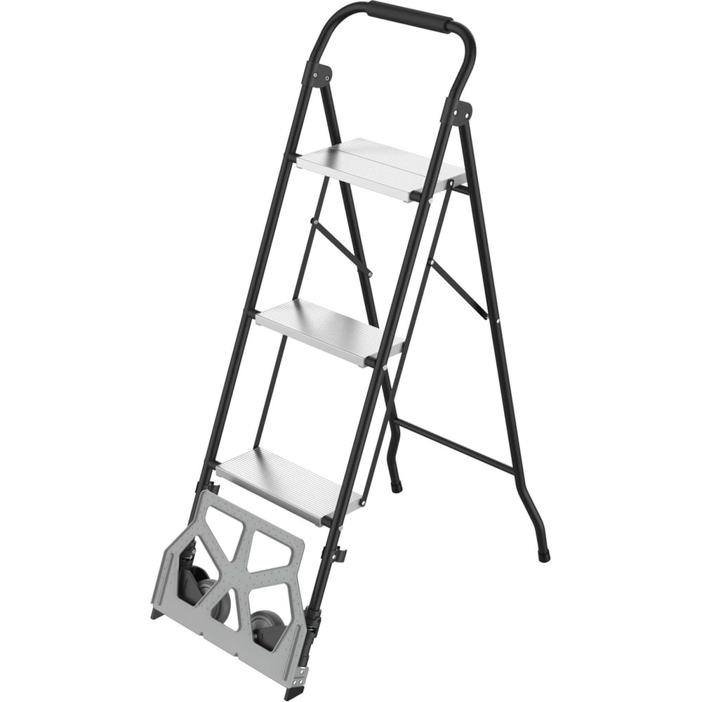 Стремянка 2в1 с колесами и платформой используется в качестве стремянки и как тележка на колесах. Ступени стремянки 30х12 см имеют рифленую противоскользящую поверхность. Размер верхней площадки 30х17 см. Для комфортного использования на поручне предусмотрена широкая, длиной 18 см, мягкая оплетка из вспененного материала. Верхняя площадка имеет замок с фиксацией положения стремянки в открытом виде. Для перехода в положении тележки - необходимо в собранном состоянии потянуть платформу вниз, автоматически развернуться колеса и тележка будет готова к использованию. Платформа имеет нижний защитный бортик для перевозимых грузов высотой 15 мм. Номинальный размер платформы 42х28.5 см (ш*в). Колеса пластиковые, диаметром 10 см, шириной 2.5 см. Колесная ось - металлическая. Основной материал: сталь и алюминий. Отделка: порошковое покрытие. Максимальная нагрузка на стремянку 150 кг., на платформу 80 кг.