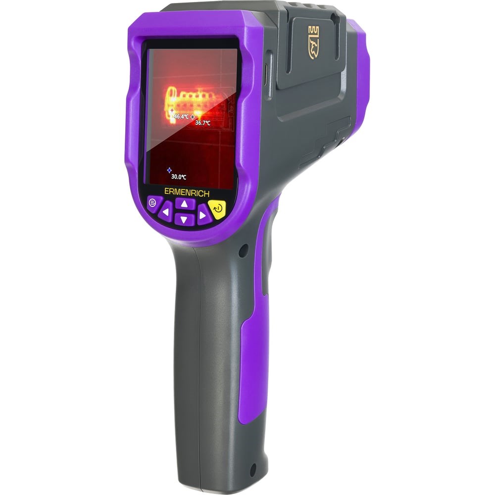 Ermenrich Seek TV70 – строительный тепловизор для обследования электрического и теплового оборудования, поиска неисправностей, утечек тепла в фасадах и фундаментах зданий. Главный элемент прибора – тепловизорный модуль 120x90 пикс с камерой 1 Мпикс, что позволяет считывать изменения температуры в диапазоне от –20 до +400 °С. Доступные режимы отображения: видимый свет, инфракрасный свет, а также режим наложения видимого и инфракрасного спектров и слияние краев. Присутствует функция «картинка в картинке». Изображение отображается на цветном экране с разрешением 240x320 пикс. Доступно 8 цветовых палитр. Замеры температуры можно фиксировать с помощью фото или видео, сохраняя результаты на встроенную карту памяти прибора. Источник питания – литиевая батарея емкостью 2600 мАч. Одного заряда хватает на 4 часа непрерывной работы. Прибор оснащен индикатором низкого уровня заряда и функцией автоматического отключения. Заряжается тепловизор с помощью кабеля USB Type-C (идет в комплекте).