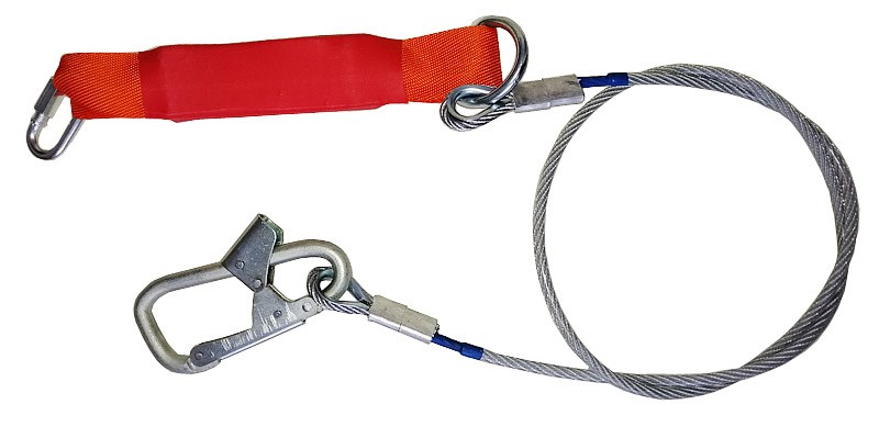 Страховочный строп из металлического троса в ПВХ оболочке с амортизатором, монтажным и соединительным карабином.