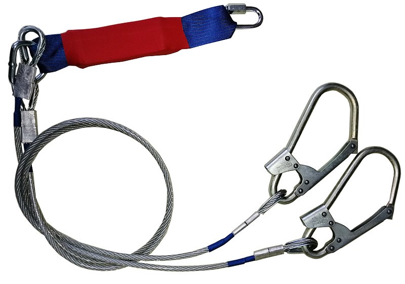 Страховочный строп, двойной (двуплечий) из металлического троса в ПВХ оболочке с амортизатором, двумя большими монтажными и одним соединительным карабином