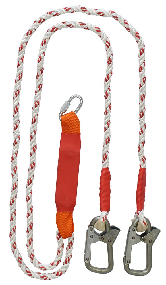 Страховочный строп, двойной (двуплечий) из полиамидного каната в оплетке с амортизатором, двумя большими монтажными и одним соединительным карабином.