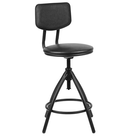 Металлический каркас обладает повышенной прочностью и надежностью. Материал обивки – кожзам, практичный и неприхотливый в уходе. Ножки стула оснащены пластиковыми заглушками для защиты напольного покрытия. Кресло имеет винтовую регулировку высоты сиденья путем вращения блока 'сиденье-спинка' вокруг оси. Опора для ног обеспечивает дополнительный комфорт. Максимальная статическая нагрузка – 150 кг.