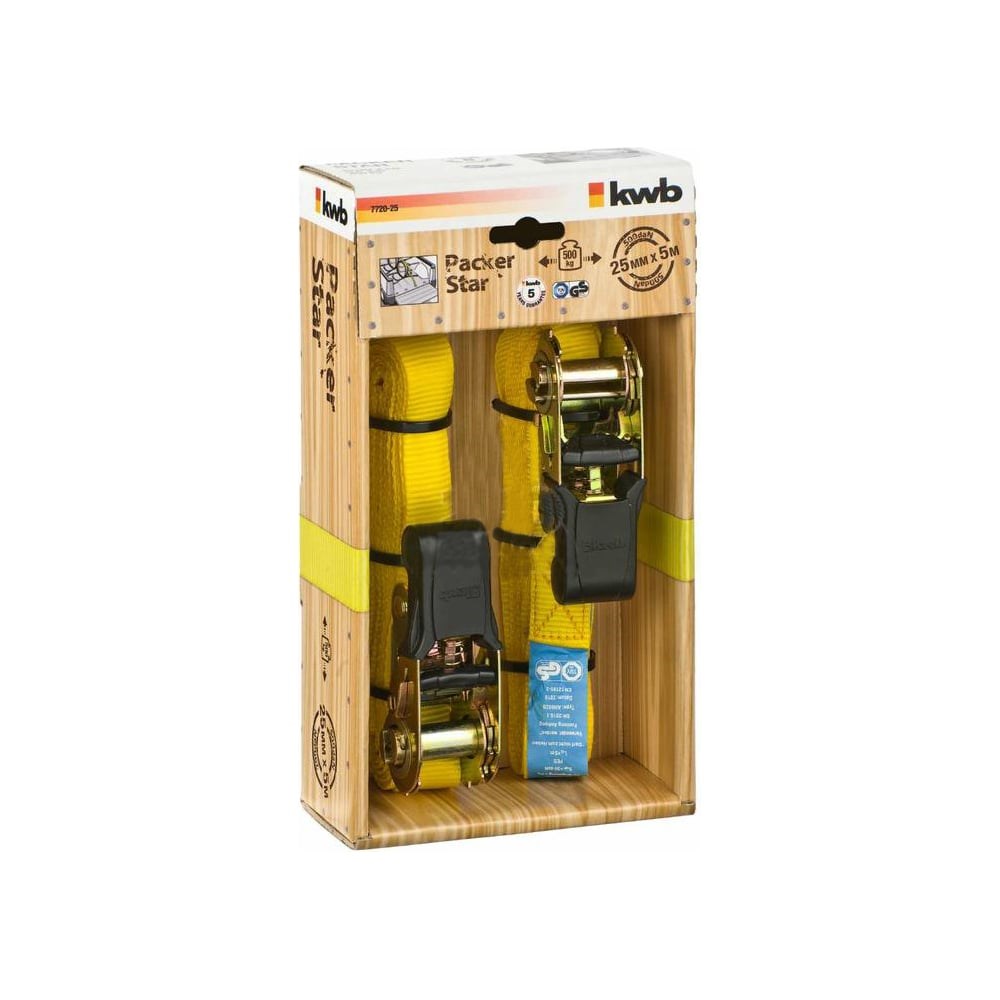 Стяжной ремень с храповиком, 5м, 2шт. KWB 7720-25 используется для обвязки, а также крепления небольших грузов (коробки, мебель и т.д.) к верхнему или прицепному багажнику легкового автомобиля, фургона и других транспортных средств. Малый вес и небольшие размеры (в сложенном состоянии) значительно облегчают хранение и переноску приспособления. Изделие характеризуются высокой прочностью и износостойкостью, не подвержено коррозии и устойчиво к влаге. Лента выполнена из полиэстровых волокон - это обеспечивает достаточное стяжное усилие, чтобы обеспечить безопасность груза во время непредвиденных маневров. Усилие на горизонтальное растяжение - 250 кг, на обхват - 500 кг. Храповик имеет пластиковое покрытие и оснащен удобным механизмом разблокировки.