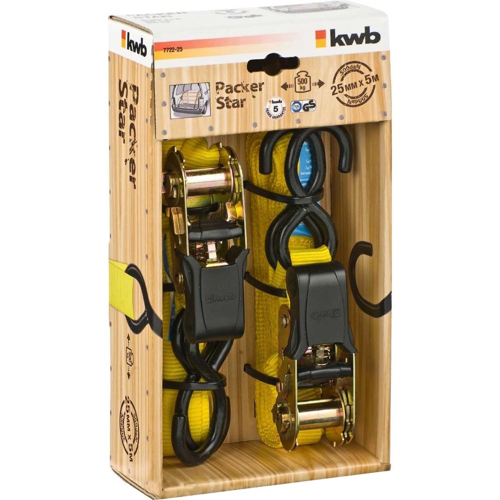 Стяжной ремень с двумя крючками, 5м, 2 шт. KWB 7722-25 - это отличное решение при выборе фиксирующих приспособлений для перевозки грузов. Изделие обладает повышенной прочностью и износостойкостью, что является гарантией его продолжительного срока службы. Полиэстровые волокна и два крюка обеспечивают достаточное усилие: на горизонтальное растяжение - 250 кг, на обхват - 500 кг. Длина ремня регулируется, а также фиксируется пользователем с помощью храповика, имеющего пластиковое покрытие и удобный в использовании механизм разблокировки.