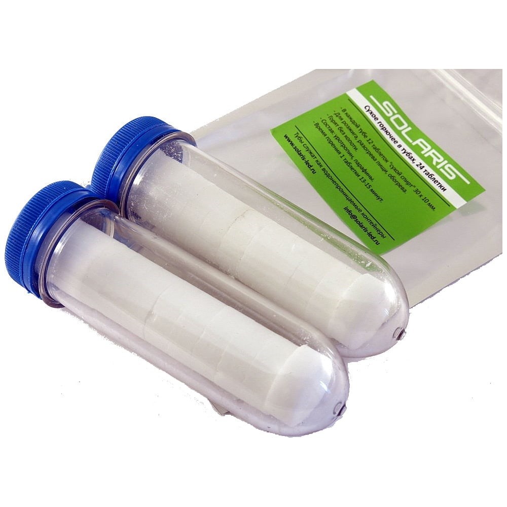Сухое горючее в тубах SOLARIS, 24 таблетки S6105 используются для розжига костра или мангала. Время горения 1 таблетки 13-15 минут. Горят без копоти, поэтому безопасно для человека.