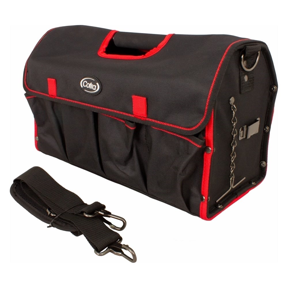 Сумка для инструментов COFRA с метал. фурнитурой, 425x200x260 мм, цвет красный/черный TC-4218WR представляет собой удобную модель для переноски и хранения инструментов и прочих пренадлежностей. Крытая сумка с текстильной крышкойКарманы - 10 внешних, 20 внутренних текстильных петель-держателейПлечевой ремень, стальные карабины, стальная ручка, стальная цепочка сбокуТекстильные застежки из нейлонаНа дне 2 рейки из полипропиленаВнутри дна и внутри боковых сторон полиэтиленовые вставки для жесткости