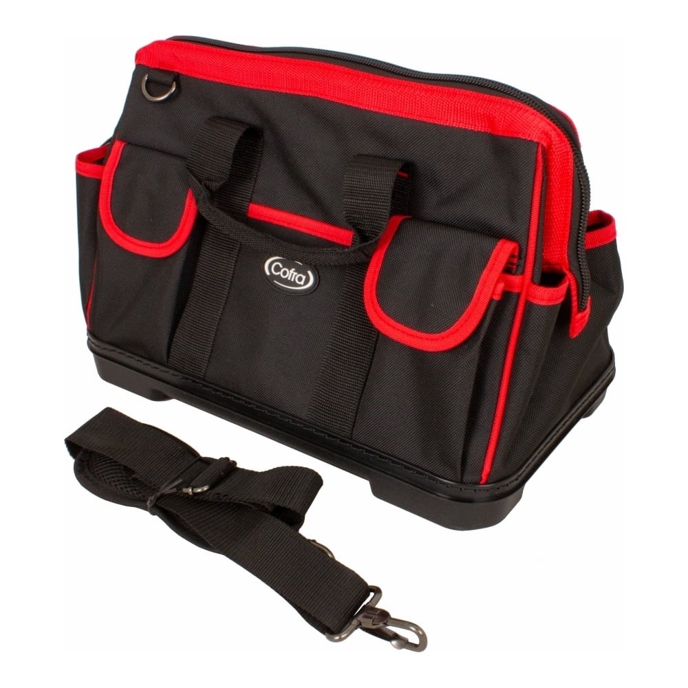 Сумка для инструментов COFRA с пластиковым дном, метал. фурнитура, 385x210x300 мм, цвет красный/черный TC-4222WR представляет собой удобную модель для переноски и хранения инструментов и прочих пренадлежностей. Жесткий каркас из стальной проволокиКарманы - 8 внешних, 10 внутреннихПлечевой ремень, стальные карабины, пластиковые регуляторы ремешков, застежка-молнияТекстильные застежки из нейлонаДно - полипропилен