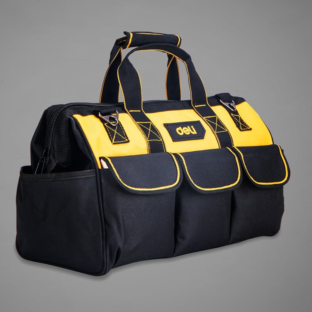 Сумка для инструментов DELI DL430117 400x200x270мм 98481 используется для хранения и транспортировки инструмента.Сумка выполнена из качественной и прочной ткани Oxford, благодаря чему не боится влаги и пыли.Невероятная вместимость - 14 карманов и объёмное основное отделение.Основание сумки оснащено стальными прутами, что придает дополнительную прочность и защиту от деформации.Прочные удобные ручки обеспечивают комфортную переноску.