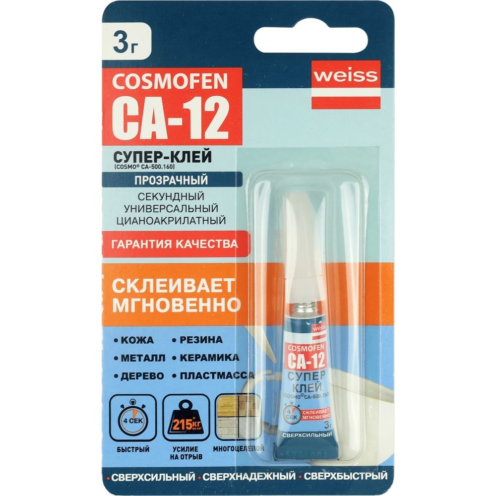 Цианоакрилатный клей COSMOFEN COSMO CA-500.200 - секундный супер-быстрый клей, обладает повышенной прочностью. По результатам испытаний клей Космофен CА-12 признан лучшим "секундным" клеем в области как бытового, так и промышленного применения! Благодаря своим уникальным характеристикам клей Космофен имеет самый широкий спектр областей применения: в быту - прекрасно склеивает все виды пластика, резину, металл, керамику и стекло, незаменим при проведении сантехнических работ, при производстве рекламной продукции, игрушек, в сфере сервисного обслуживания и ремонта автомобилей. Время выдерживания склеиваемых поверхностей составляет считанные секунды.СФЕРА ПРИМЕНЕНИЯ:Для склеивания уплотнительных профилей из EPDM и для приклеивания EPDM к профилям из жесткого ПВХ и алюминиевым профилям в оконном производстве.Для склеивания силиконовых уплотнителей и уплотнителей из TPE.Склеивание различных видов пластмасс, эластомеров, резины.Для склеивания полимерных материалов.Примечание о месте производства: В рамках оптимизации логистики Weiss Chemie + Technik GmbH & Co. KG размещает производство COSMO® на площадках в Германии и КНР. Все предприятия работают по единым стандартам качества и технологиям, что гарантирует соответствие продукции высоким стандартам бренда независимо от места производства. Поставки осуществляются в зависимости от доступности складских запасов.