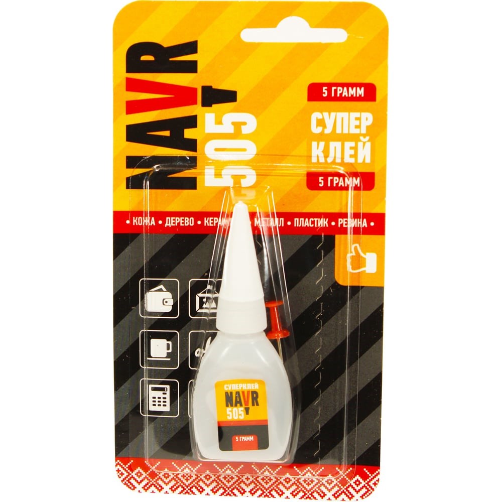 Суперклей Navr 505 5 г NV5055 обеспечивает мгновенное соединение материалов. Клеевой шов устойчив к влаге и органическим растворителям. Со временем качество клеевого соединения не теряет своей прочности и свойств. Универсален, им можно склеить: керамику, металл, пластик, резину, дерево, кожу. В каждой упаковке есть иголка, которая поможет плотно закупорить отверстие носика между применениями. Применение Очистите, высушите и обезжирьте ацетоном или бензином соединяемые поверхности. Снимите верхнюю часть колпачка. Пробейте пластиковую мембрану носика тубы с помощью кнопки( входит в комплект). Нанесите клей равномерным тонким слоем на одну из поверхностей. Чем тоньше слой клея, тем прочнее будет соединение. Не смещая склеиваемые поверхности сильно прижмите их друг к другу на 5-20 секунд. Удалите остатки клея с носика тубы и закрутите до упора верхнюю часть колпачка. Функциональная прочность клеевого соединения достигается за 10-15 мин. Не применять для склеивания изделий контактирующих с пищевыми продуктами. Состав: этилцианокрилат, добавки.
