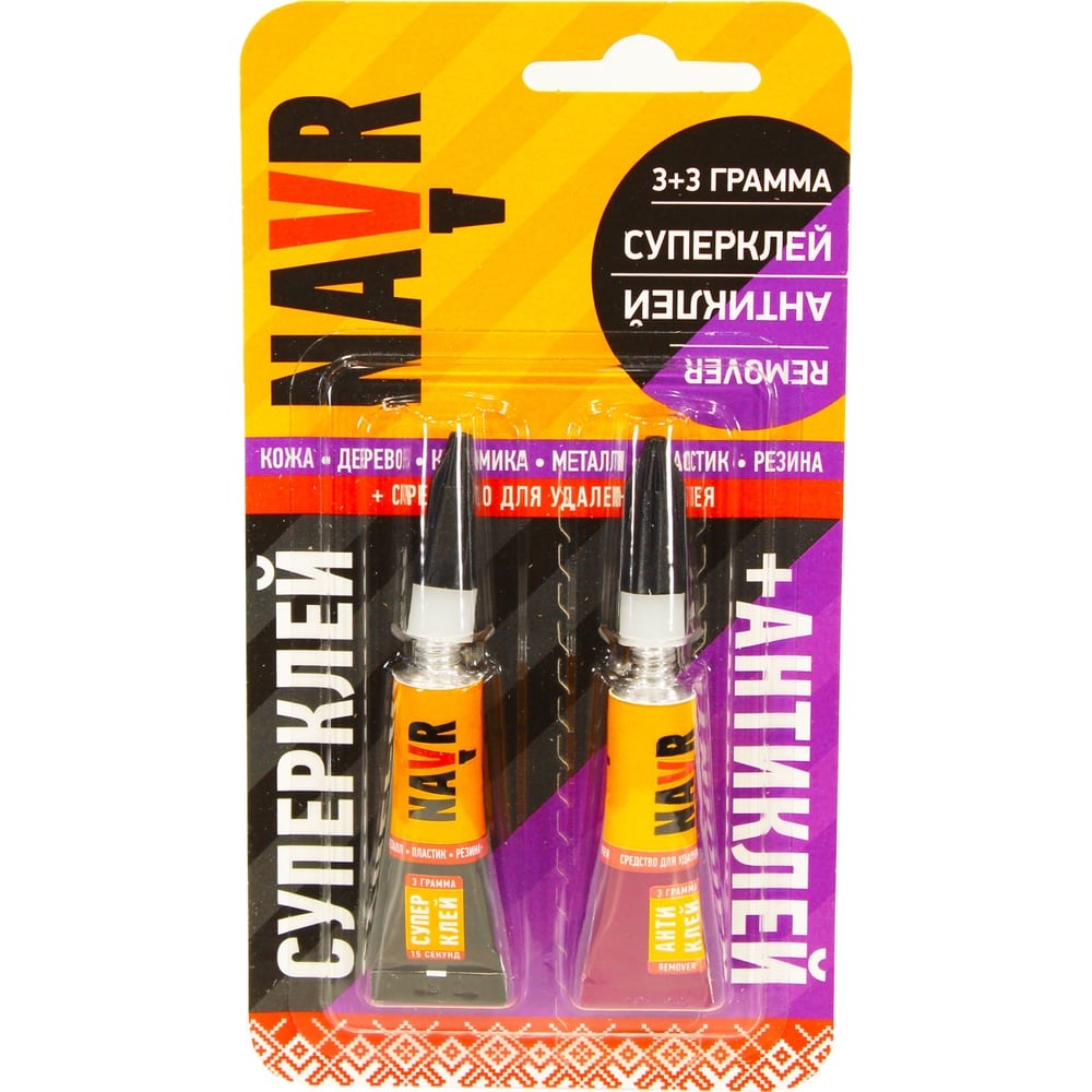 Суперклей+антиклей Navr 3+3 г NVSA3 обеспечивает мгновенное соединение материалов. Клеевой шов устойчив к влаге и органическим растворителям. Со временем качество клеевого соединения не теряет своей прочности и свойств. Универсальное применение. Способен склеивать керамику, металл и различный пластик, а также резину, дерево и кожу. Это быстрый и надежный моментальный клей. Не рекомендуется использовать для склеивания полиэтилена, полипропилена и посуды, используемой для приема пищи внутрь. Антиклей – предназначен для удаления пятен и излишков застывшего супер клея и ряда других клеев с различных поверхностей. Не использовать на закрашенных или лакированных поверхностях.