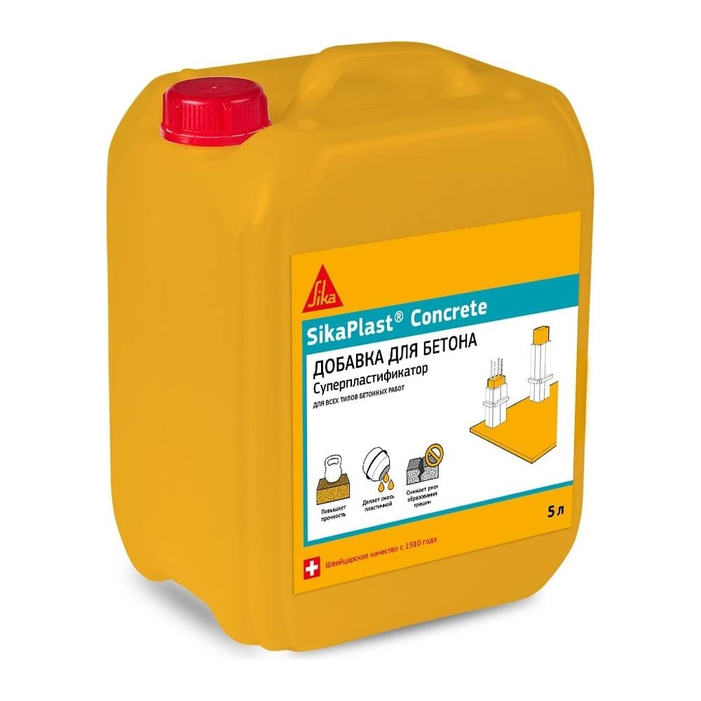 Суперпластификатор для бетонаSikaPlast® Concrete – эффективная суперпластифицирующая добавка, предназначенная для производства высококачественных бетонных смесей и получения бетонов с высокими эксплуатационными характеристиками. Удовлетворяет требованиям ТУ20.59.59-024-13613997-2019.Мощное пластифицирующее действиеВысокая сохраняемость подвижности бетонной смесиВысокое водоредуцирование (до 30%)Применяется при производстве бетона для устройства фундаментов, стен, колонн и перекрытий в жилых и общественных зданиях. Высокий тиксотропный эффект SikaPlast® Concrete позволяет ускорить укладку бетонной смеси, снизить затраты на виброуплотнение и позволяет изготавливать высококачественные монолитные железобетонные конструкции.Рекомендуемая дозировка 0,6 – 1,5% жидкой добавки от массы цемента.