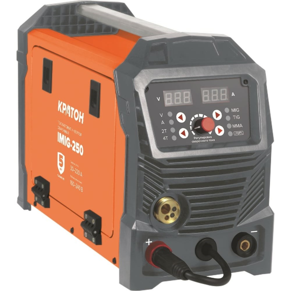 Сварочный инвертор полуавтомат КРАТОН IMIG250 3 04 02 024 предназначен: Для полуавтоматической сварки постоянным током с помощью плавящейся сварочной проволоки в среде защитных инертных газов (метод MIG), и защитных активных газов (метод MAG) Для полуавтоматической сварки постоянным током с помощью самозащитной плавящейся сварочной проволоки без использования защитных газов (метод FLUX) Для полуавтоматической сварки постоянным током с помощью неплавящегося вольфрамового электрода в среде защитных газов (метод TIG) Для ручной дуговой сварки постоянным током, штучным плавящимся покрытым металлическим электродом (метод MMA) Методы сварки MIG, MAG, FLUX применяют при сварке углеродистых сталей, чугуна, нержавеющей стали, меди и медных сплавов, и других цветных металлов. Этими видами сварки получают сварные швы неразъемных соединений при сборке металлических конструкций. Метод сварки TIG на постоянном токе применяется для сварки любой углеродистой низколегированной или высоколегированной стали, в том числе и нержавеющей стали, и тяжелых цветных металлов (медь, никель, титан и их сплавов). Метод сварки MMA применяют при сварке углеродистых и нержавеющих сталей. Ручной дуговой сваркой получают сварные швы неразъемных соединений при сборке металлических конструкций. Аппарат оснащен удобной панелью управления с цифровым дисплеем. Термостатическая защита от перегрева обеспечивает безопасную работу и долгий срок службы.Режим "Индуктивность" уменьшает разбрызгивание сварочной проволоки.