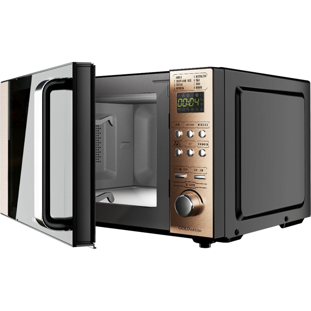 Стильная микроволновая печь Centek CT-1574 благородного золотого цвета и хромированной отделкой – незаменимый помощник на любой современной кухне. Без поворотного стола, способна выполнять задачи по приготовлению, подогреву и размораживанию продуктов. Поддерживает 8 автоматических программ приготовления, функцию «Мультиповар» (приготовление блюд в несколько этапов), имеет электронное управление и LED-дисплей.Благодаря технологии эффективного распределения волн отсутствует поворотный стол для удобства использования посуды любой формы.Печь равномерно и практически бесшумно прогревает пищу.В камере печи отсутствуют труднодоступные места, поэтому очистка прибора не вызывает затруднений.Внутреннее керамическое покрытие печи не впитывает запахи и не склонно к загрязнению, ржавчине или расслоению. Гладкая внешняя поверхность легко очищается.СВЧ-печь имеет прочную и малогабаритную конструкцию, соответствующую официальным стандартам безопасности.
