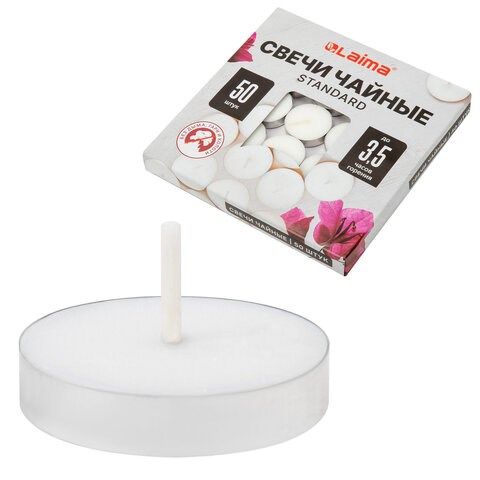 Свечи чайные Standard, до 3,5 часов горения, вес 9 г, КОМПЛЕКТ 50 шт., в гильзе, LAIMA, 609197