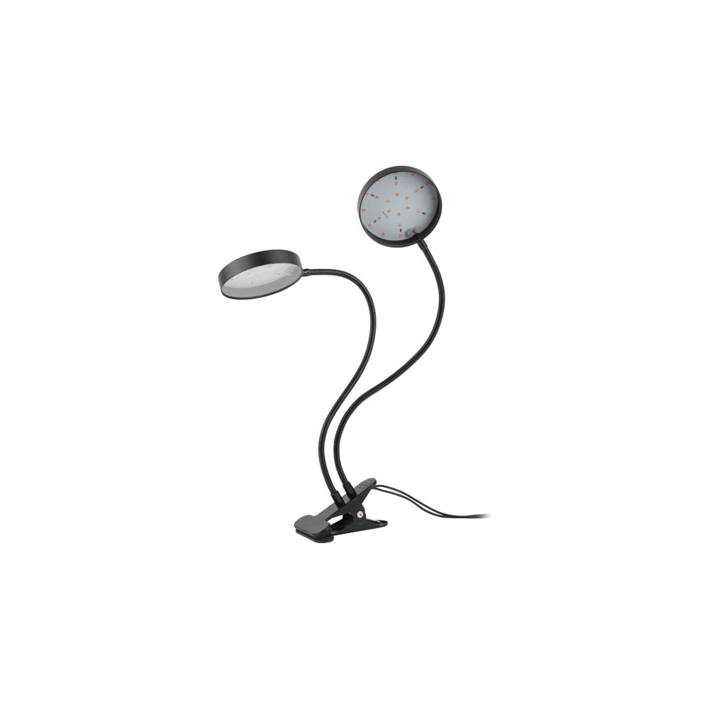 Стильный домашний фитосветильник с двумя круглыми плафонами на гибких стойках. Благодаря тугой металлической прищепке быстро и надёжно фиксируется на подоконнике, столешнице, полке. алюминиевый корпус прочен и обеспечивает хорошую теплоотдачу светодиодов. Направление света каждого из светодиодных плафонов легко регулируется. Округлая форма плафонов выглядит стильно и обеспечивает широкий световой поток. Прищепка позволяет устанавливать фитосветильник как горизонтально, так и вертикально. Прибор выглядит аккуратно и современно, отлично вписывается в любой интерьер. Красно-синий спектр свечения фитосветильника эффективен для вегетационного развития рассады, комнатных растений, выращивания цветов, ягод, завязи и вызревания плодов. По 24 светодиода на каждой из 2-х ламп. Мощность фитосветильника - 20 Вт. Эффективность - 22 мкмоль/с. Надёжный проверенный блок питания поможет фитосветильнику работать много лет. Качественные светодиоды последнего поколения не перегорают и не теряют яркость со временем. Диаметр каждой из светодиодных плат - 98 мм. Длина стоек - 380 мм. Провод 1500 мм с удобным кнопочным выключателем.