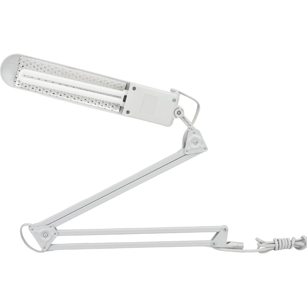 Светильник Дельта (с ЭПРА), на пластиковой струбцине, с люминесцентной лампой с цоколем 2G7 мощностью 11Вт (в комплекте), цвет - серый. Выключатель кнопочный на плафоне. Подходит для использования в жилых помещениях и учебных заведениях, в офисах, а также в медицинских учреждениях и пр.