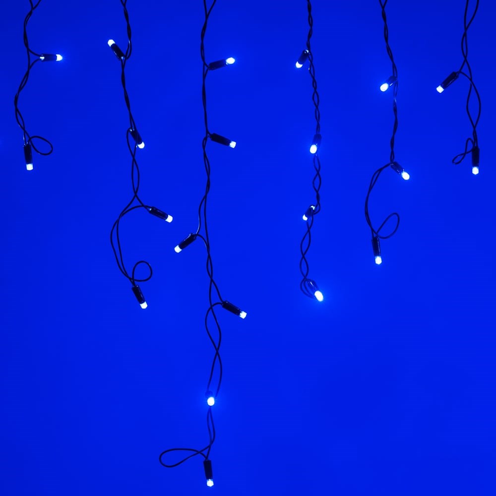 Светодиодная бахрома Classic. Размер 2400x600 мм (длина 2400 мм, по длине 24 нити высотой 200/600 мм). Количество светодиодов 88 размером 7 мм. Цвет свечения СИНИЙ, эффект постоянного свечения с резким световым рисунком (прозрачная вогнутая линза). Провод черный, ПВХ. Применение на улице под навесом. Аксессуары для подключения приобретаются отдельно.