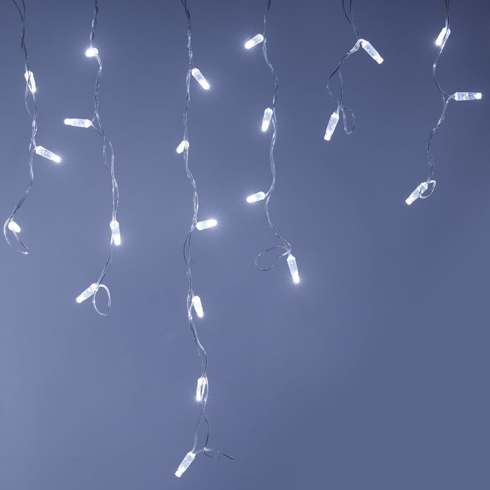 Светодиодная бахрома Classic. Размер 2400 мм (длина 2400 мм, по длине 24 нити высотой 200/600 мм). Количество светодиодов 88 шт размером 7 мм. Основной цвет свечения БЕЛЫЙ (6000 К), эффект мерцания редких точек (БЕЛЫЙ 6000К) с мягким световым рисунком (выпуклая молочно-белая линза), соотношение светодиодов: 66 белых постоянного свечения / 12 белых с мерцанием. Провод прозрачный, ПВХ. Применение на улице под навесом. Аксессуары для подключения приобретаются отдельно.
