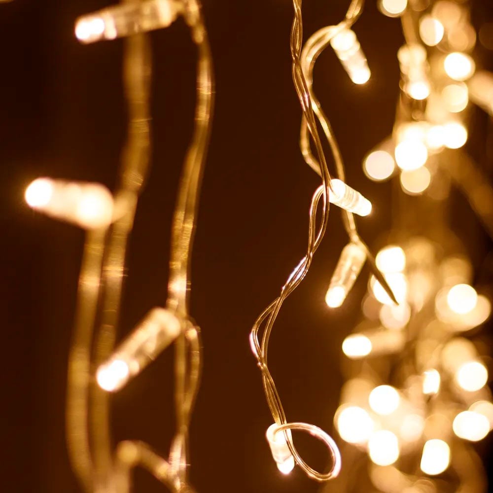 Светодиодная бахрома Classic. Размер 2400x600 мм (длина 2400 мм, по длине 24 нити высотой 200/600 мм). Количество светодиодов 88 шт размером 7 мм. Цвет свечения ТЕПЛЫЙ БЕЛЫЙ (3000 К), эффект постоянного свечения с мягким световым рисунком (выпуклая молочно-белая линза). Провод прозрачный, ПВХ. Питание 230 В, Мощность 6 Вт, защита IP65, применение на улице под навесом. Аксессуары для подключения приобретаются отдельно.