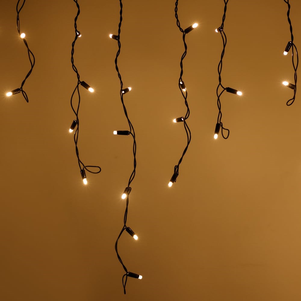 Светодиодная бахрома PRO. Размер 4000 мм (длина 4000 мм, по длине 32 нити высотой 200/600 мм). Количество светодиодов 128 шт размером 7 мм. Основной цвет свечения ТЕПЛЫЙ БЕЛЫЙ (3000 К), эффект мерцания редких точек (БЕЛЫЙ 6000К) с резким световым рисунком (прозрачная вогнутая линза), соотношение светодиодов: 106 теплых постоянного свечения / 22 белых с мерцанием. Эффект частого мерцания. Провод черный, каучук. Применение на улице под навесом. Аксессуары для подключения приобретаются отдельно.