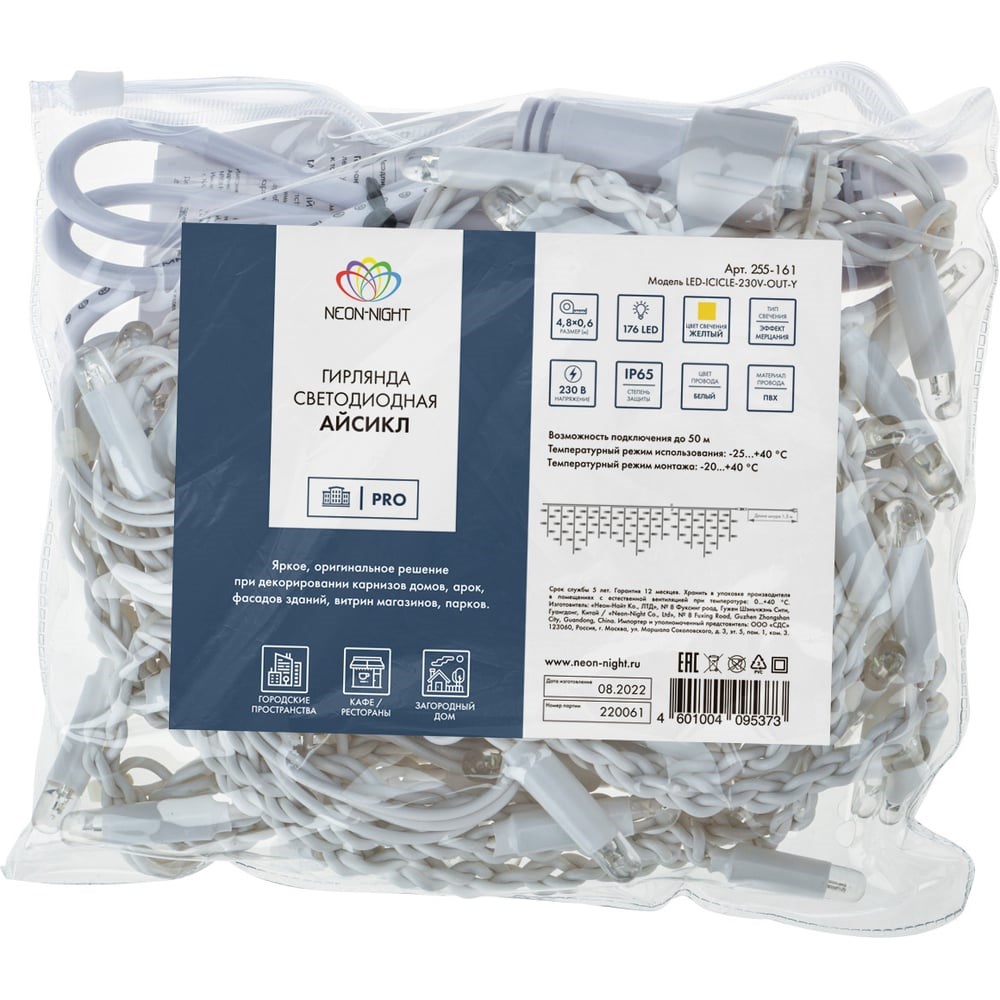 Гирлянда Айсикл (Бахрома) представляет собой гибкий горизонтальный шнур-шину, к которому через определенные промежутки крепятся вертикальные нити разной длины со светодиодами. Она имитирует сосульки и может послужить оригинальным решением при украшении карнизов, арок, фасадов зданий, витрин магазинов, а также стать эффектным элементом декора внутри помещений.Благодаря использованию светодиодов отличительной особенностью гирлянды является превосходная яркость и низкое энергопотребление. При длине 4,8 м гибкая направляющая имеет 48 вертикальных нитей от 20 до 60 см.Данная гирлянда имеет желтый цвет свечения и предназначена для использования как внутри помещений, так и снаружи.Наличие мерцающих светодиодов белого цвета привлекает внимание и значительно преображает украшенную поверхность (мерцает каждый пятый светодиод).Внимание! Для подключения необходимо приобрести шнур питания 303-500-1.