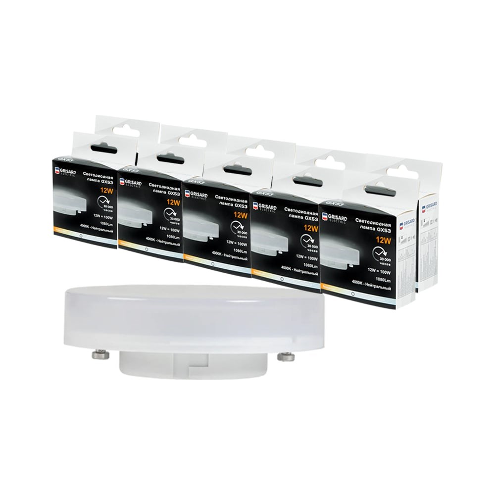 Светодиодная лампа Grisard Electric таблетка Т75 GX53 12Вт 4000К (10 шт/уп) GRE-002-0078 дает свет без мерцания, на протяжении всего срока службы, а работают до 30000 часов, заменяет собой 30 простых или 3 энергосберегающие лампы. За счет низкого нагрева применяется даже с натяжными потолками и в качестве подсветки в корпусной мебели или над рабочей зоной. Лампочка обеспечивает естественный дневной свет, не раздражающий глаза, а цветовая температура 4000К позволяет установку в офисных или жилых помещениях. Не искажает цвета и дает равномерный свет в 1080 Лм, заменяет лампу накаливания в 100 Вт.