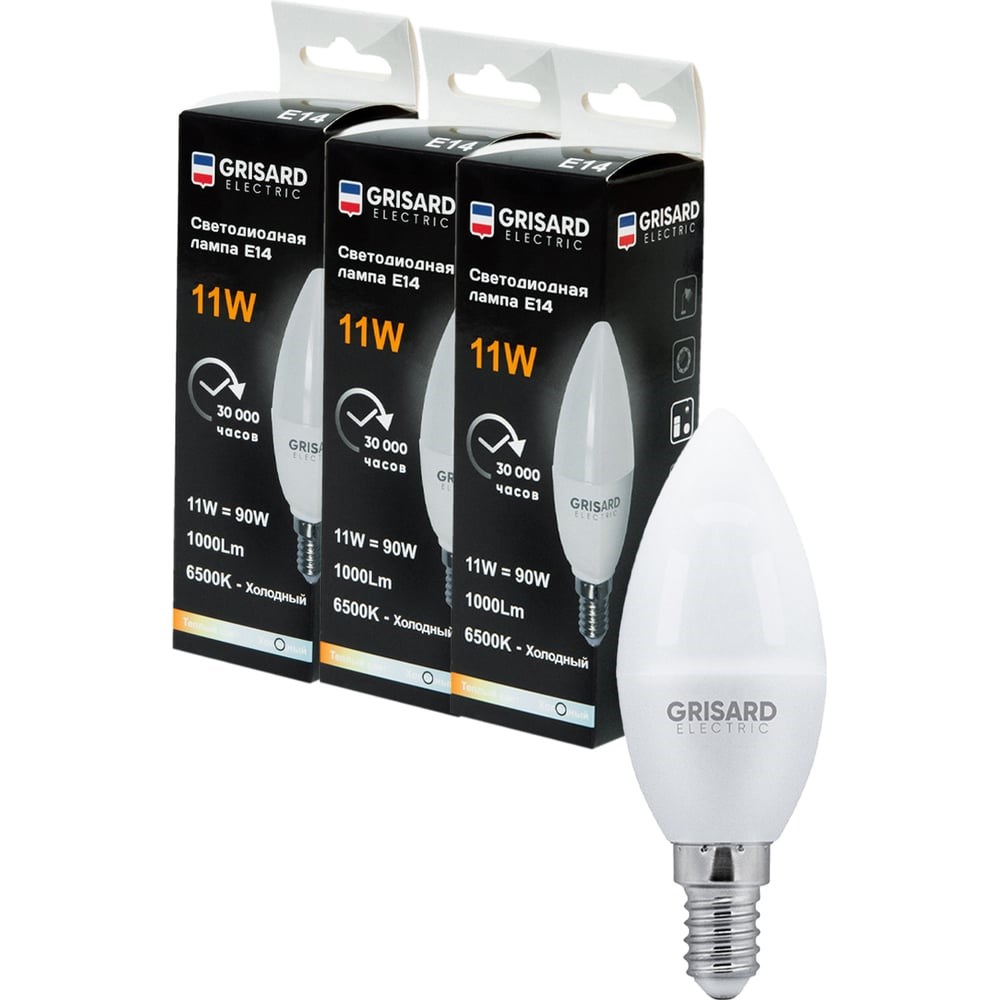 Светодиодная лампа Grisard Electric свеча С35 E14 11Вт 6500K (3 штуки) GRE-002-0111(3) дает свет без мерцания, на протяжении всего срока службы, а работает до 30000 часов, заменяет собой 30 простых или 3 энергосберегающие лампы. LED лампы свечи безопасны. За счет низкого нагрева, лампочка Е14 применяется даже с натяжными потолками и в качестве подсветки в корпусной мебели или над рабочей зоной. Светодиодная лампочка обеспечивает свет, не раздражающий глаза, а цветовая температура 6500К позволяет установку в офисных или жилых помещениях. Не искажает цвета и дает равномерный свет в 1000 Лм, заменяет лампу накаливания в 90 Вт. Проста в эксплуатации и радует экономичностью, так как мощность при всех характеристиках всего 11 Вт.