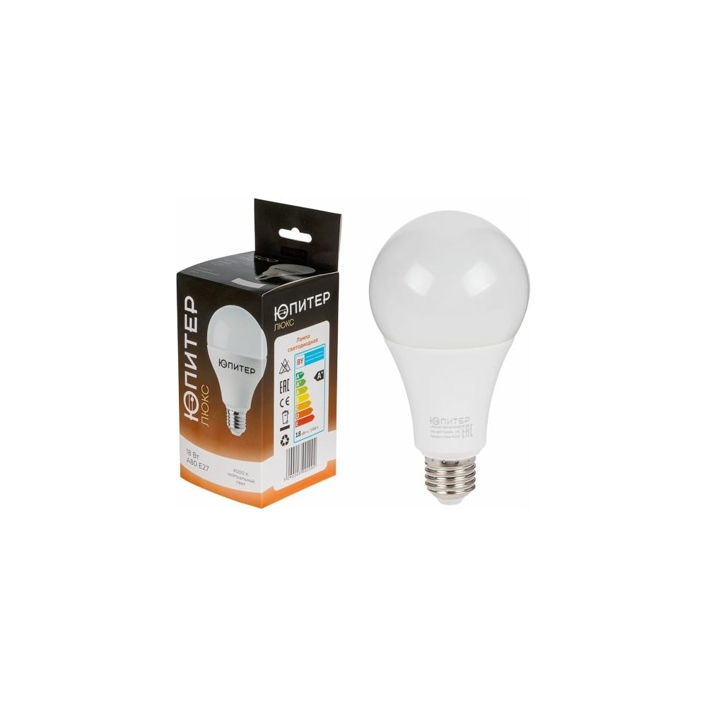 Светодиодная лампа ЮПИТЕР E27 ЛЮКС 18 Вт A80 4000K JP5160-43 обеспечивает равномерный поток света без пульсации и устойчивость к перепадам напряжения. Алюминиевый радиатор в пластиковом кожухе обеспечивает низкую температуру нагрева за счёт отвода тепла от основных частей лампы продлевая ее срок службы. Благодаря высокому индексу цветопередачи объекты в свете лампы выглядят натурально, видимый цвет освещаемого тела соответствует естественному. Цветовая температура 4000 К - нейтральный, естественно белый цвет для жилых комнат, кухни, рабочих мест, офисов, уголков для чтения. Лампы Юпитер не создают электромагнитных помех другимустройствам. Также соответствуют всем стандартам по энергобезопасности (белорусские сертификаты таможенного союза). Класс А+ энергоэффективности гарантирует максимальную световую отдачу при минимальных затратах на энергопотребление (белорусский сертификат). На каждую лампу нанесена маркировка, необходимая для розничной торговли (в соответствии с СТБ 1400-2009 и техническими регламентами).