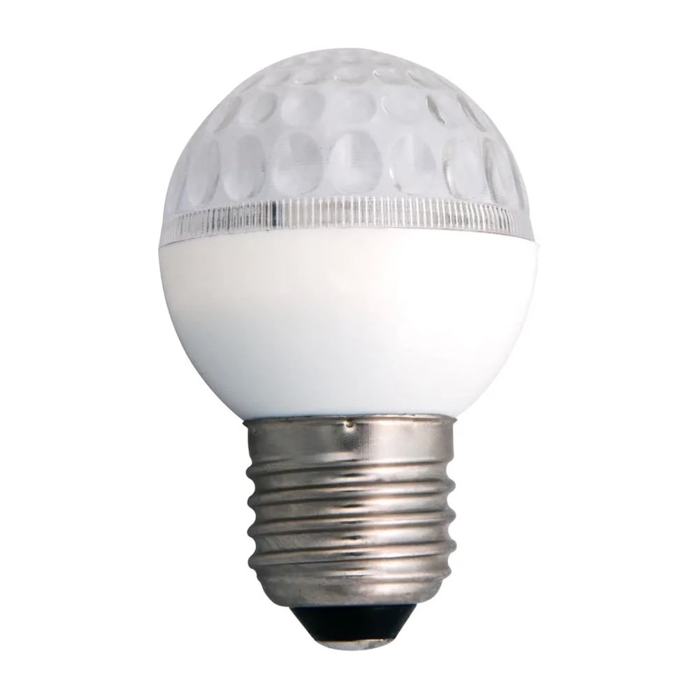 Декоративная светодиодная лампа в форме шара со стандартным цоколем Е27 идеально подходит для украшения улиц, фасадов зданий и интерьеров. Суммарная мощность светодиодов составляет всего 1 Вт, что позволяет снизить затраты на электроэнергию и подключать гирлянды большей длины.Ударопрочный поликарбонат обеспечивает надёжность и долговечность лампы.