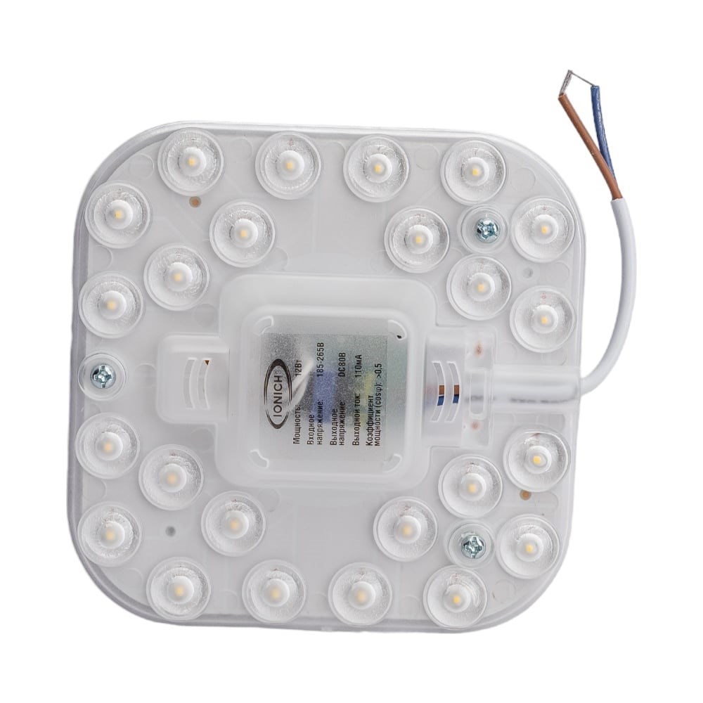 Светодиодный модуль IONICH для декоративных светильников 12 Вт 960 Лм 230 В 4000 К 105x105 мм IP20 2076 со встроенным драйвером предназначен для замены стандартных ламп, а также современных светодиодных источников света, которые уже повсеместно используются в настенно-потолочных светильниках. Применяется для: Модернизации светильников с традиционными источниками света (лампа накаливания, КЛЛ); Замены вышедших из строя светодиодных плат в светильниках; В качестве самостоятельного источника освещения, без установки плафона/рассеивателя.