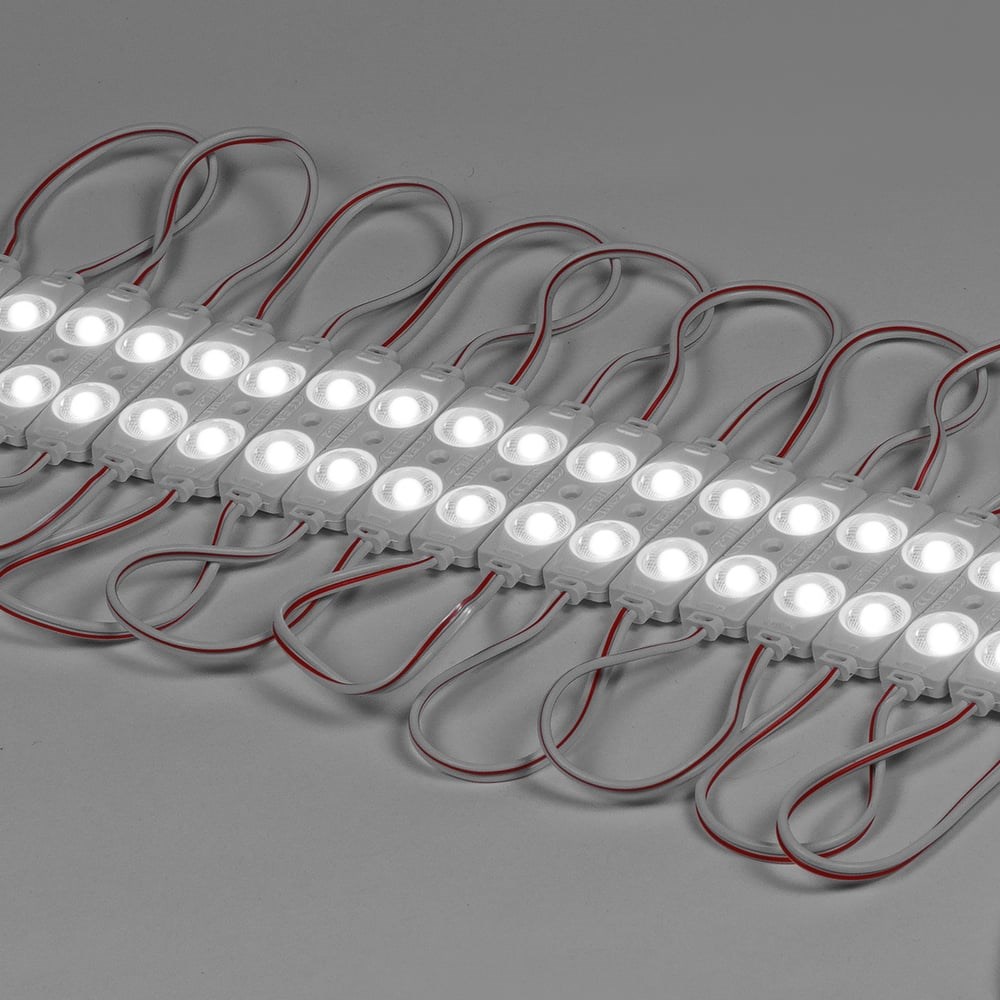 Светодиодный модуль Donled 0.72Вт, 12В, IP65, SMD2835 2LED, 70лм, холодный белый, 20 шт./гирлянда DL-THL-2 предназначен для внутреннего и наружного освещения, рекламных вывесок, световых коробов, объемных букв. Продается гирляндами по 20 штук, соединены между собой и могут отрезаться в нужном количестве. Потребляемый ток 60±2mA. Длина провода между модулями 120 мм, рекомендуемая глубина установки 90-120 мм. Светодиодный модуль имеет удобный крепежный элемент - двусторонний скотч + "отверстие" для жесткой фиксации. Светодиодные модули рассчитаны на постоянное напряжение 12 B, поэтому при подключении к сети 220 В потребуется соответствующий блок питания на 12 В 20 Вт из расчета на 20 модулей (с учетом запаса мощности). Электромонтаж достаточно прост и производится методом пайки, либо при помощи коннекторов и клеммных колодок (в комплект не входят).