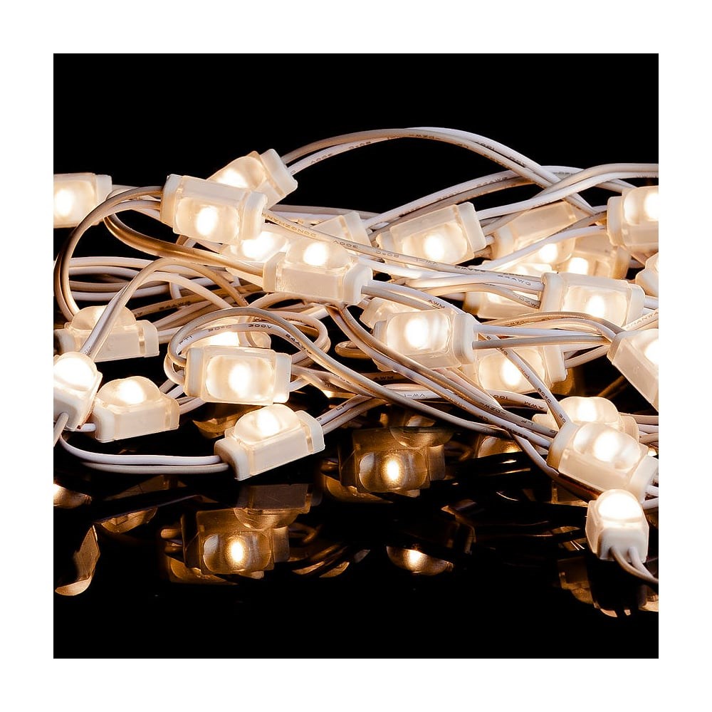 Светодиодный модуль MAKSILED 0.24Вт, 12В, IP67, SMD2835 1LED, 33лм, нейтральный белый, 50 шт./упаковка ML-M1SNE-OL-2835-NW-LP предназначен для внутреннего и наружного освещения, рекламных вывесок, световых коробов, объемных букв. Продается гирляндами по 50 штук, соединены между собой и могут отрезаться в нужном количестве. Угол 130°х170°. Потребляемый ток 0.02A. Длина провода между модулями 70 мм, рекомендуемая глубина установки 30-70 мм. Имеет удобный крепежный элемент - двусторонний скотч. Светодиодные модули рассчитаны на постоянное напряжение 12 B, поэтому при подключении к сети 220 В потребуется соответствующий блок питания на 12 вольт 20 Вт из расчета на 50 модулей (с учетом запаса мощности). Электромонтаж достаточно прост и производится методом пайки, либо при помощи коннекторов и клеммных колодок (в комплект не входят).