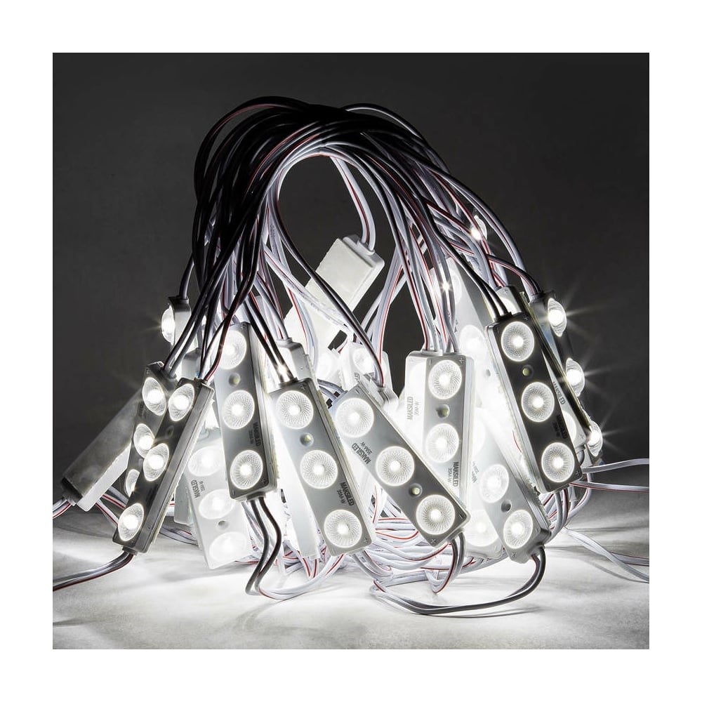 Светодиодный модуль MAKSILED 1.44Вт, 12В, IP67, SMD2835 3LED, 240лм, холодный белый, 20 шт./упаковка ML-M3SM-L-2835-W предназначен для внутреннего и наружного освещения, рекламных вывесок, световых коробов, объемных букв. Степень защиты IP67, напряжение 12 В, мощность 1.44 Вт, световой поток 240 лм, угол 173°. Потребл. ток 120±5mA. Длина провода между модулями 230 мм, рекомендуемая глубина установки 80-120 мм. Размер 72x19x10 мм. Гарантия 3 года. Светодиодный модуль имеет удобный крепежный элемент – двусторонний скотч + "отверстие" для жесткой фиксации. Светодиодные модули рассчитаны на постоянное напряжение 12 B, поэтому при подключении к сети 220 В потребуется соответствующий блок питания на 12 вольт 35 Вт из расчета на 20 модулей (с учетом запаса мощности). Электромонтаж достаточно прост и производится методом пайки, либо при помощи коннекторов и клеммных колодок (в комплект не входят).
