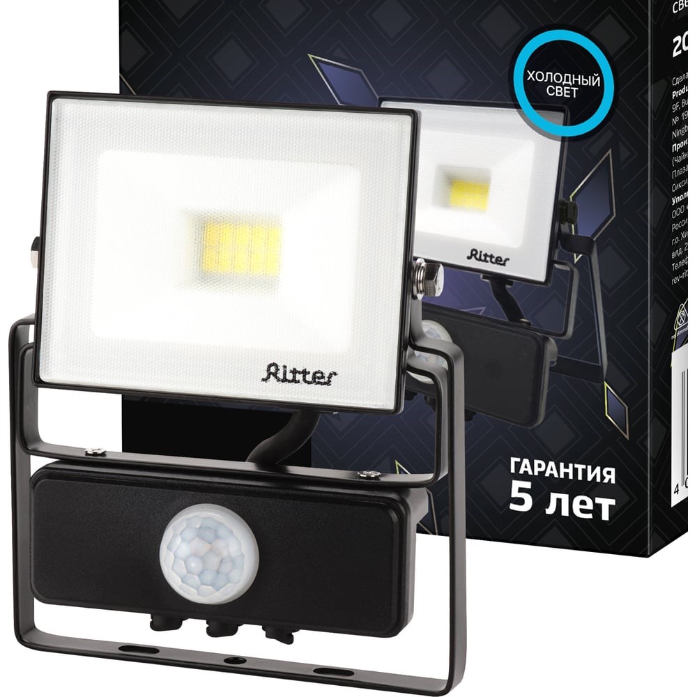 Светодиодный прожектор RITTER серия PROFI 230В 20 Вт 6500К 2000Лм IP65 с датчиком движения черный 53420 8 предназначен для общего и акцентного освещения больших открытых территорий, домов, зданий, сооружений и промышленных объектов. Оснащен датчиком движения с возможностью регулировки чувствительности и времени отключения, что позволит настроить комфортный уровень работы прожектора. Прочный алюминиевый корпус и закаленное стекло защищают прожектор от неблагоприятных погодных условий и при этом обладают высокими теплопроводными характеристиками. Прожекторы серии PROFI не теряют своей эффективности при снижении напряжения в сети до 180 В, а использование новейших светодиодных технологий позволяет получить мощный светодиодный поток при низком потреблении электроэнергии.